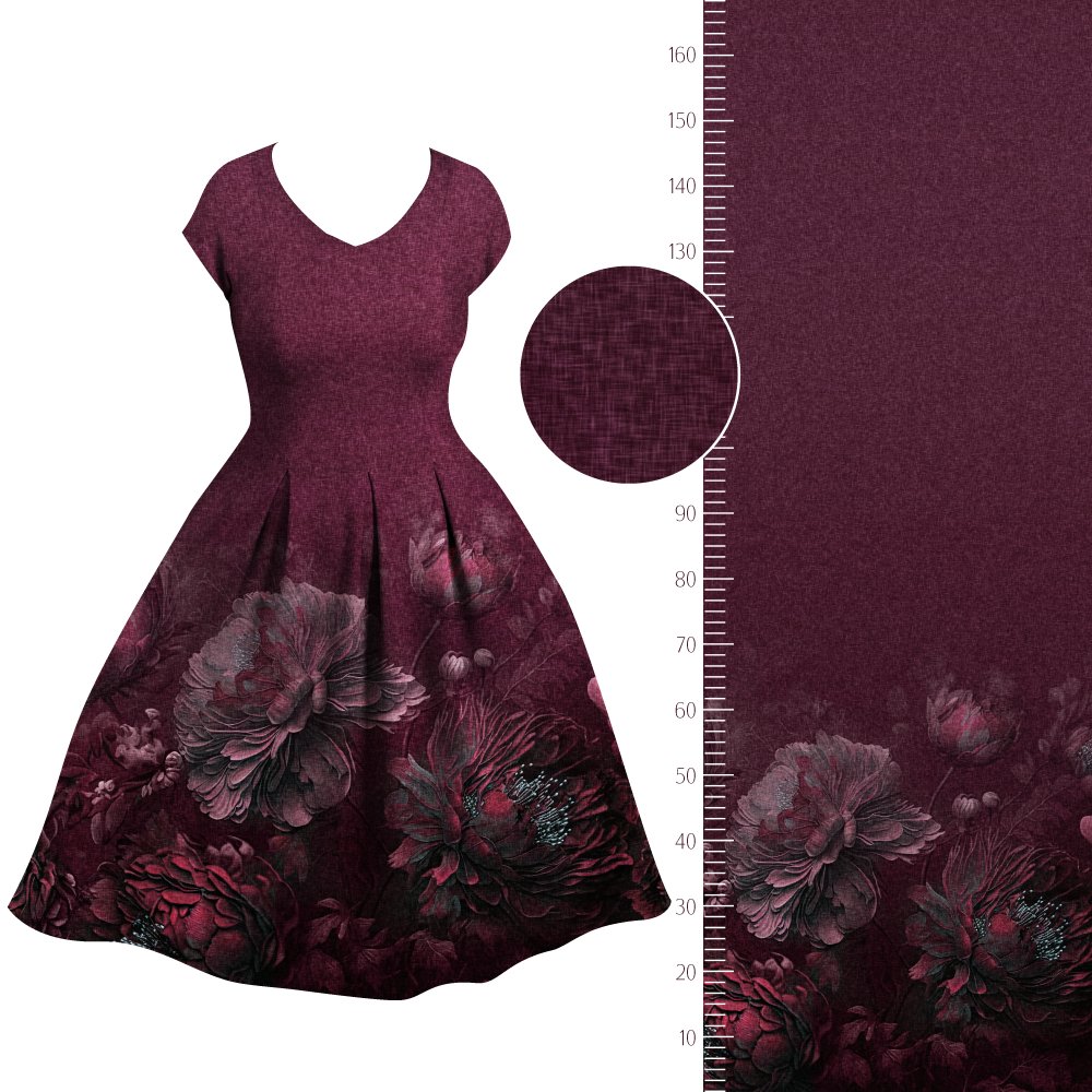 Der Fadenlauf der Bordüre (einseitig und ca. 60 cm breit) ist quer zum Muster, was jedoch kein Problem darstellt, da der Stoff in beide Richtungen gleich elastisch ist und auch in beide Richtungen gleich schön fällt.