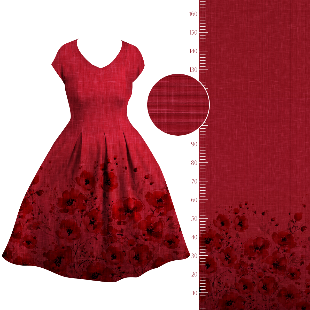 Der Fadenlauf der Bordüre (einseitig und ca. 50 cm breit) ist quer zum Muster, was jedoch kein Problem darstellt, da der Stoff in beide Richtungen gleich elastisch ist und auch in beide Richtungen gleich schön fällt.