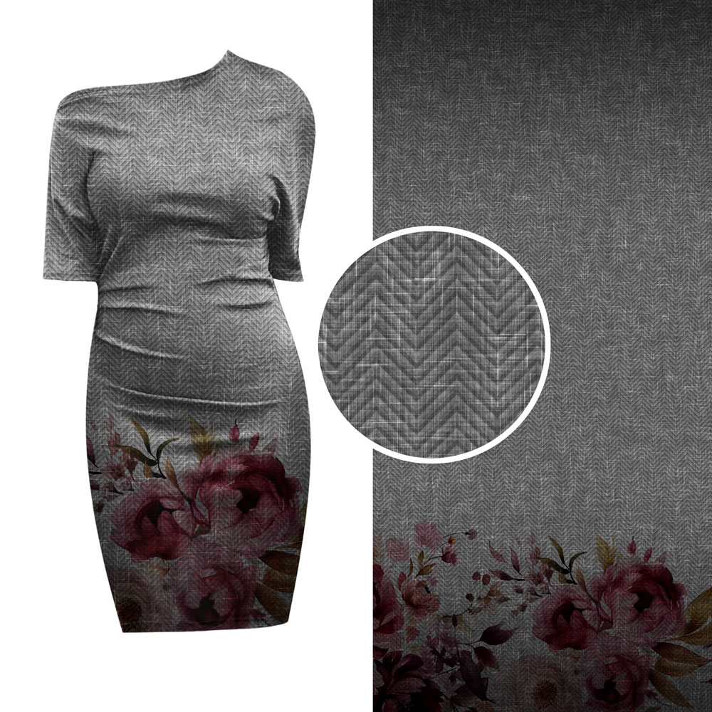 Die Blumenbordüre ist einseitig und ca.40 cm hoch. Das Muster ist endlos, es ist kein Panel. Der Fadenlauf ist quer zum Muster, was jedoch kein Problem darstellt, da der Stoff in beide Richtungen gleich elastisch ist und auch in beide Richtungen gleich schön fällt.