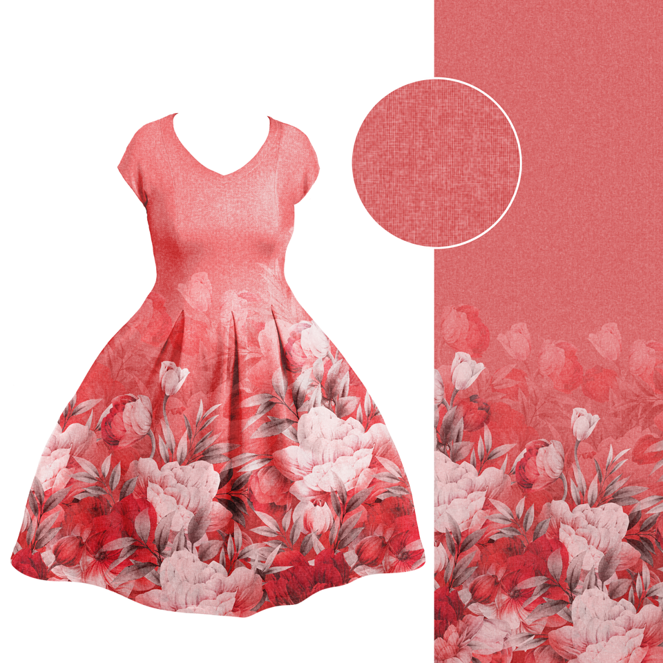 Die Bordüre ist einseitig und ca. 80 cm hoch, für normal lange und Maxikleider geeignet. Der Fadenlauf ist quer zum Muster, was jedoch kein Problem darstellt, da der Stoff in beide Richtungen gleich elastisch ist und auch in beide Richtungen gleich schön fällt.