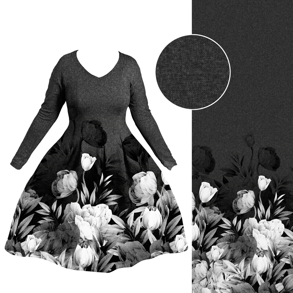 Die Bordüre ist einseitig und ca. 75 cm hoch, für normal lange und Maxikleider geeignet. Der Fadenlauf ist quer zum Muster, was jedoch kein Problem darstellt, da der Stoff in beide Richtungen gleich elastisch ist und auch in beide Richtungen gleich schön fällt.
