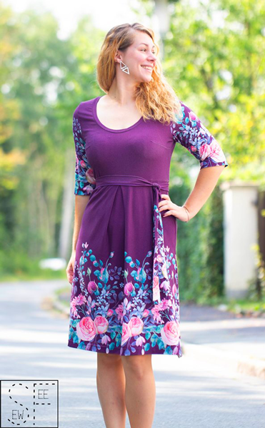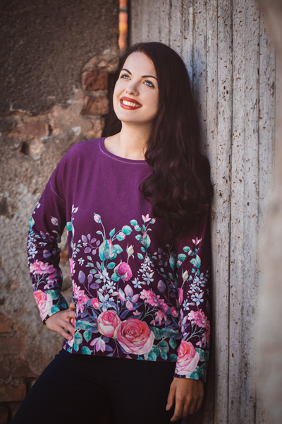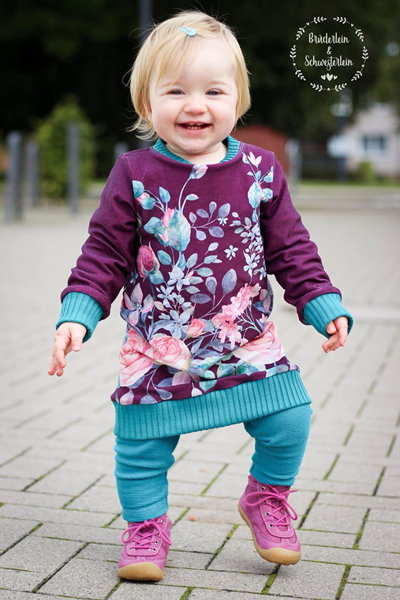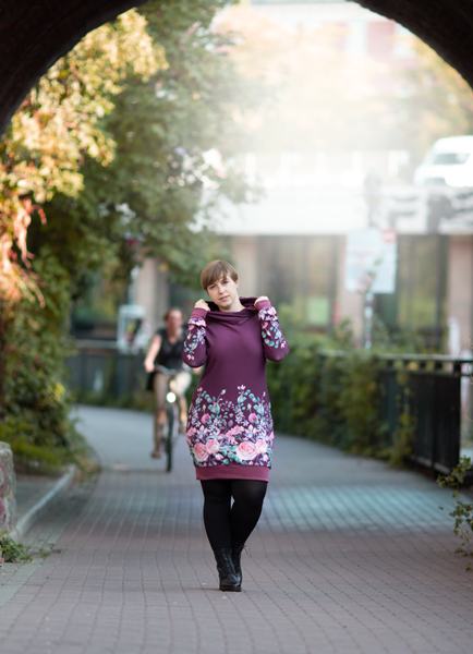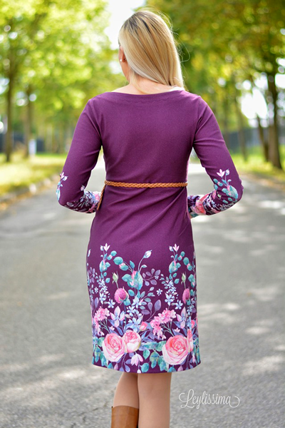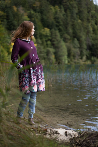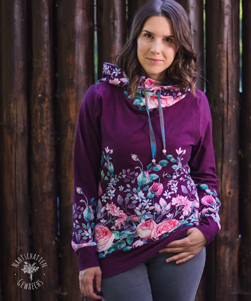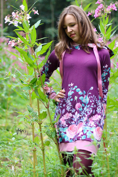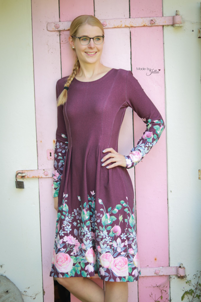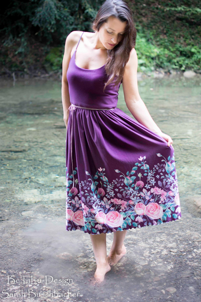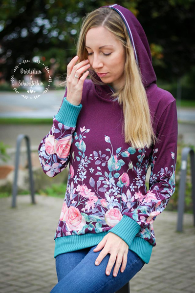 Die Bordüre verläuft rechts und links und ist ca. 30 cm breit. Der Fadenlauf ist somit quer zum Muster, was jedoch kein Problem darstellt, da der Stoff in beide Richtungen gleich elastisch ist und auch in beide Richtungen gleich schön fällt.