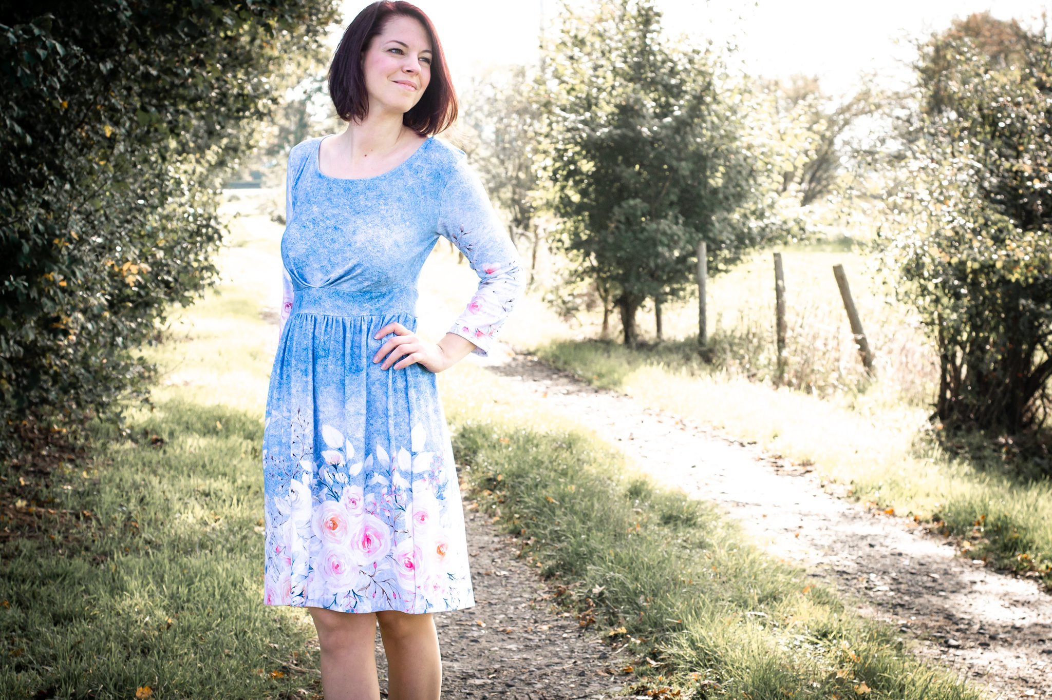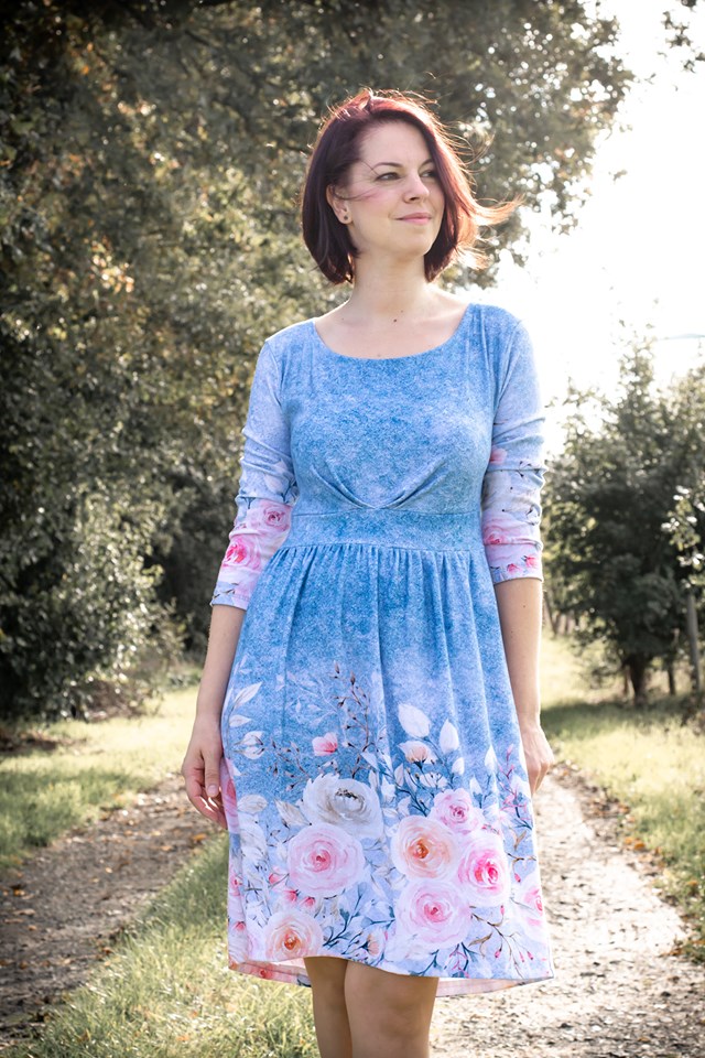 Die Bordüre verläuft rechts und links und ist ca. 30 cm breit. Der Fadenlauf ist somit quer zum Muster, was jedoch kein Problem darstellt, da der Stoff in beide Richtungen gleich elastisch ist und auch in beide Richtungen gleich schön fällt.