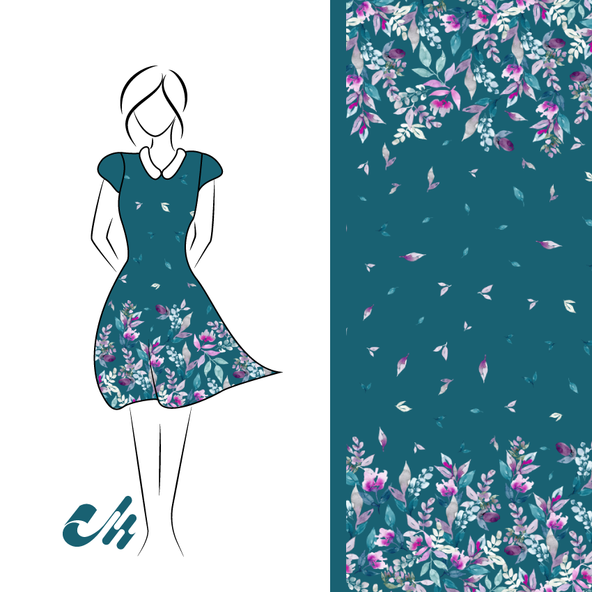 Die Bordüre verläuft rechts und links und ist ca. 30 cm breit. Der Fadenlauf ist somit quer zum Muster, was jedoch kein Problem darstellt, da der Stoff in beide Richtungen gleich elastisch ist und auch in beide Richtungen gleich schön fällt.