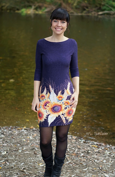 Die Bordüre verläuft rechts und links und ist ca. 30 cm breit. Der Fadenlauf ist somit quer zum Muster, was jedoch kein Problem darstellt, da der Stoff in beide Richtungen gleich elastisch ist und auch in beide Richtungen gleich schön fällt.