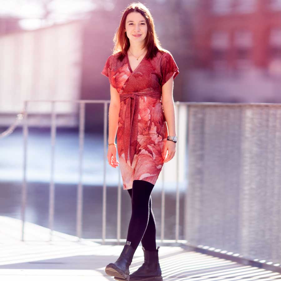 Die Bordüre ist einseitig un d ca. 100 cm hoch, für normal lange und Maxikleider geeignet. Der Fadenlauf ist quer zum Muster, was jedoch kein Problem darstellt, da der Stoff in beide Richtungen gleich elastisch ist und auch in beide Richtungen gleich schön fällt.