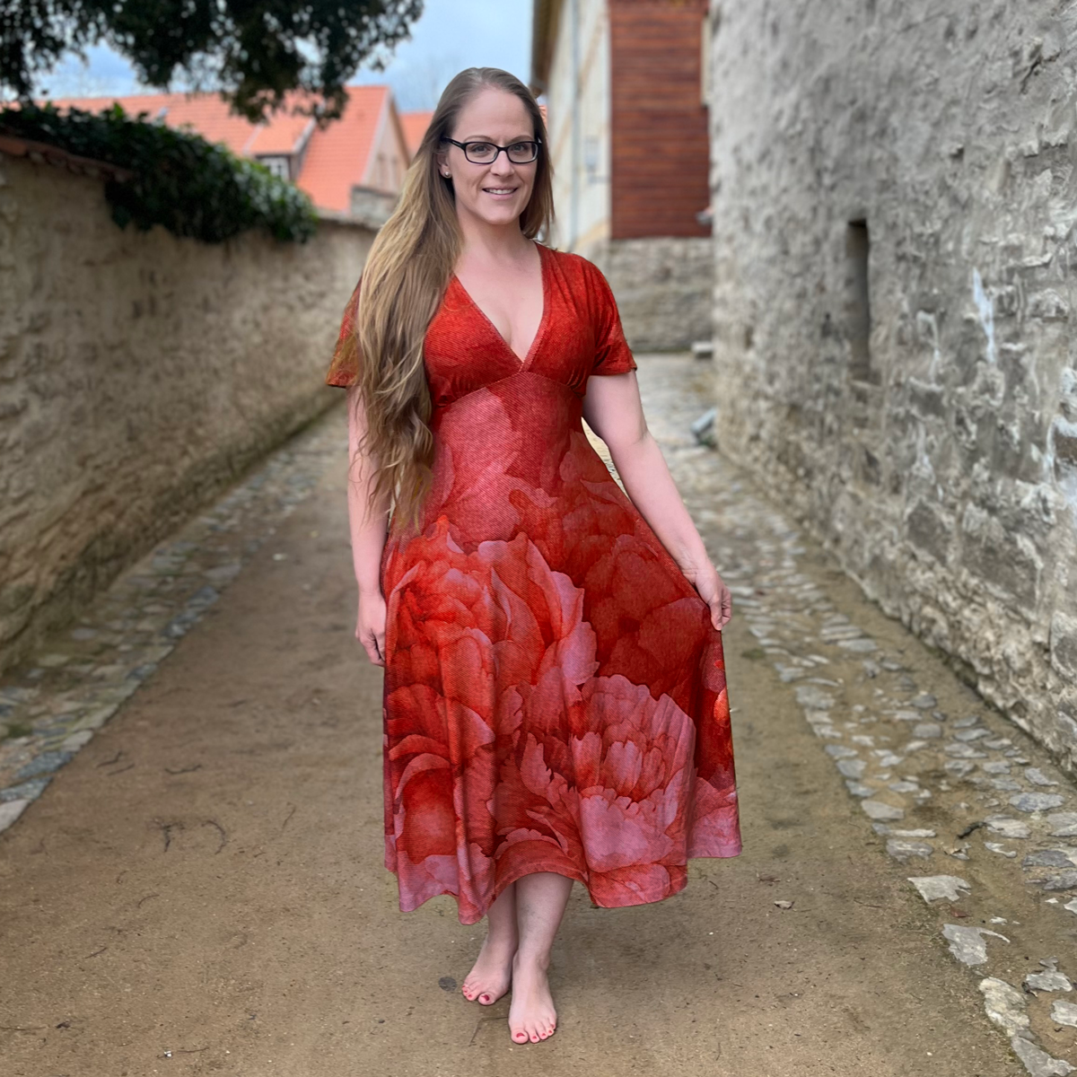 Die Bordüre ist einseitig und ca. 100 cm hoch, für normal lange und Maxikleider geeignet. Der Fadenlauf ist quer zum Muster, was jedoch kein Problem darstellt, da der Stoff in beide Richtungen gleich elastisch ist und auch in beide Richtungen gleich schön fällt.