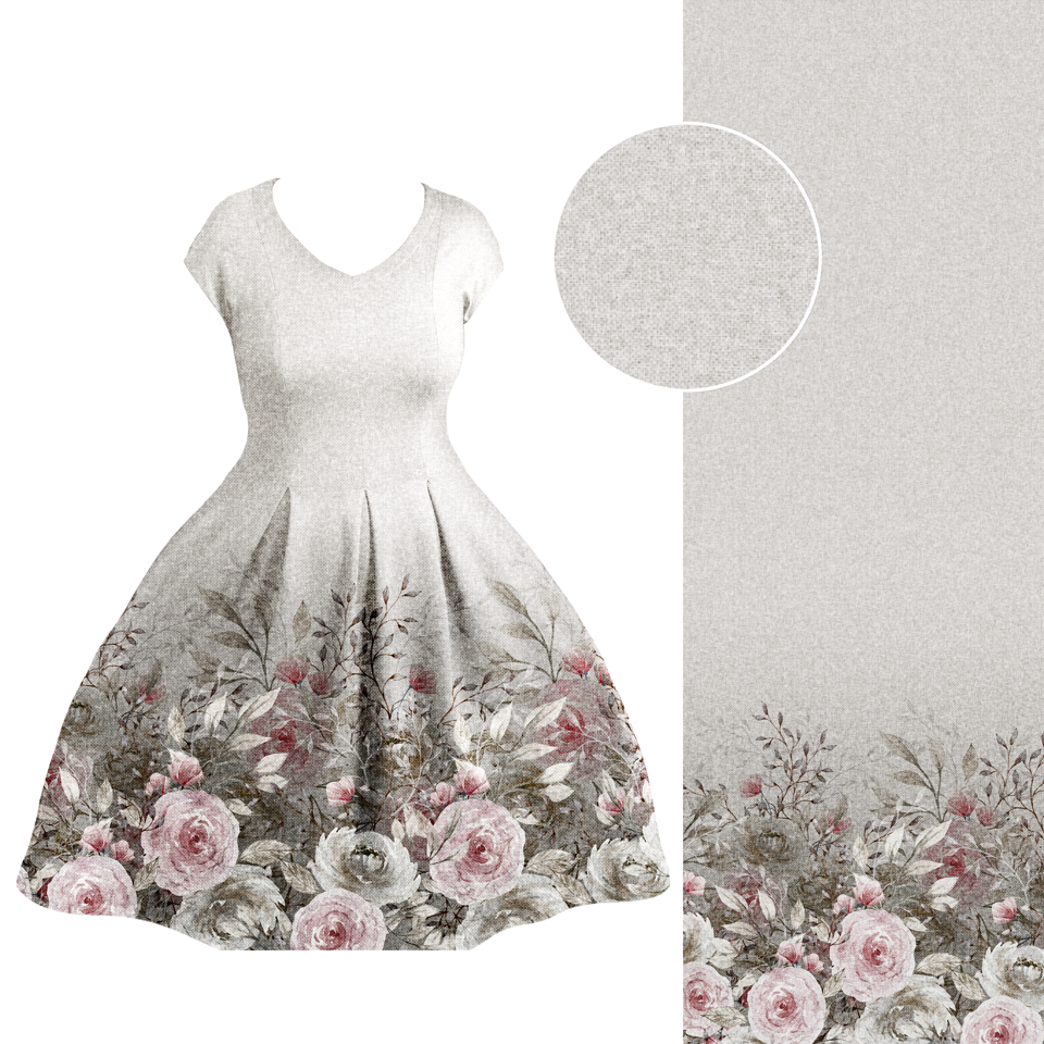 Die Bordüre ist einseitig und ca. 55 cm hoch, für normal lange und Maxikleider geeignet. Der Fadenlauf ist quer zum Muster, was jedoch kein Problem darstellt, da der Stoff in beide Richtungen gleich elastisch ist und auch in beide Richtungen gleich schön fällt.