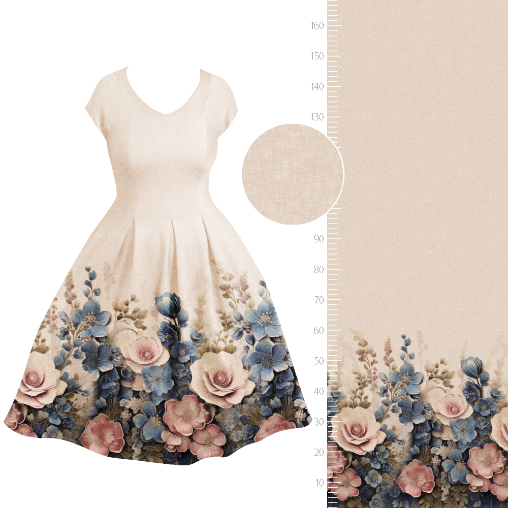 Der Fadenlauf der Bordüre (einseitig und ca. 55 cm breit) ist quer zum Muster, was jedoch kein Problem darstellt, da der Stoff in beide Richtungen gleich elastisch ist und auch in beide Richtungen gleich schön fällt.