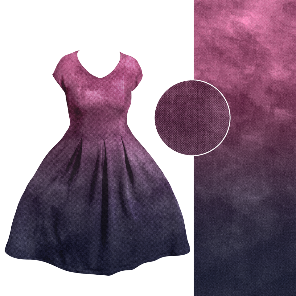 Der Verlauf ist von Webkante zur Webkante, für normal lange und Maxikleider geeignet. Der Fadenlauf ist quer zum Muster, was jedoch kein Problem darstellt, da der Stoff in beide Richtungen gleich elastisch ist und auch in beide Richtungen gleich schön fällt.