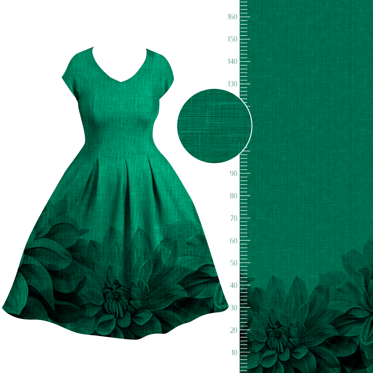 Der Fadenlauf der Bordüre (einseitig und ca. 50 cm breit) ist quer zum Muster, was jedoch kein Problem darstellt, da der Stoff in beide Richtungen gleich elastisch ist und auch in beide Richtungen gleich schön fällt.