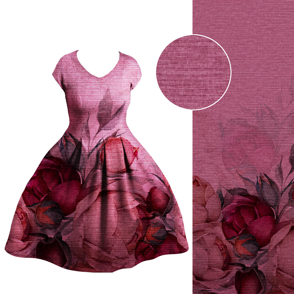 Die Bordüre ist einseitig und ca. 70 cm hoch, für normal lange und Maxikleider geeignet. Der Fadenlauf ist quer zum Muster, was jedoch kein Problem darstellt, da der Stoff in beide Richtungen gleich elastisch ist und auch in beide Richtungen gleich schön fällt.