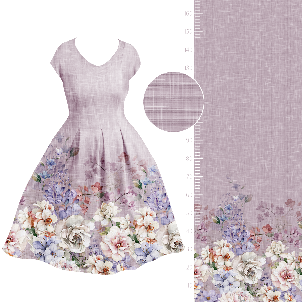 Der Fadenlauf der Bordüre (einseitig und ca. 60 cm breit) ist quer zum Muster, was jedoch kein Problem darstellt, da der Stoff in beide Richtungen gleich elastisch ist und auch in beide Richtungen gleich schön fällt.