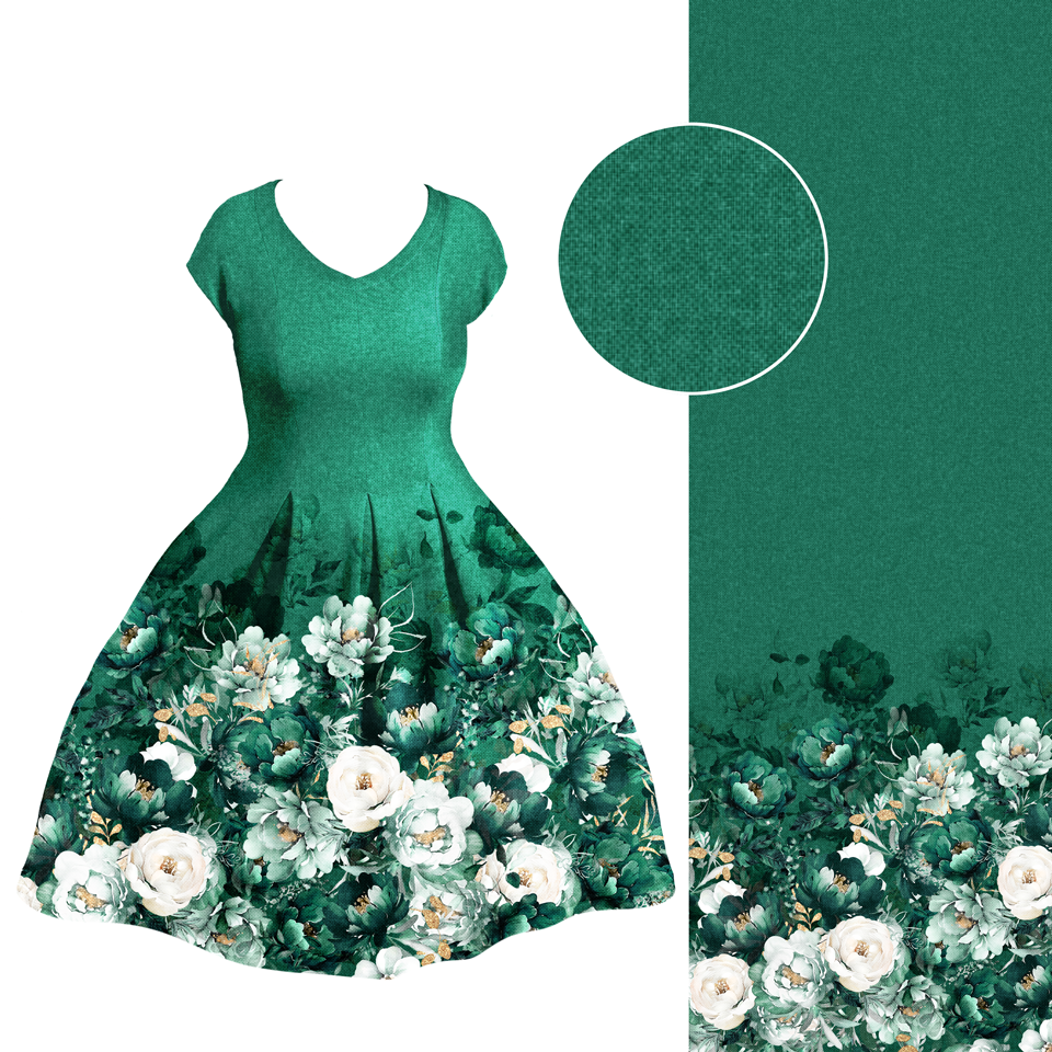 Die Bordüre ist einseitig 60 cm hoch und verläuft entlang der Webkante. Der Fadenlauf ist quer zum Muster, was jedoch kein Problem darstellt, da der Stoff in beide Richtungen gleich elastisch ist und auch in beide Richtungen gleich schön fällt.