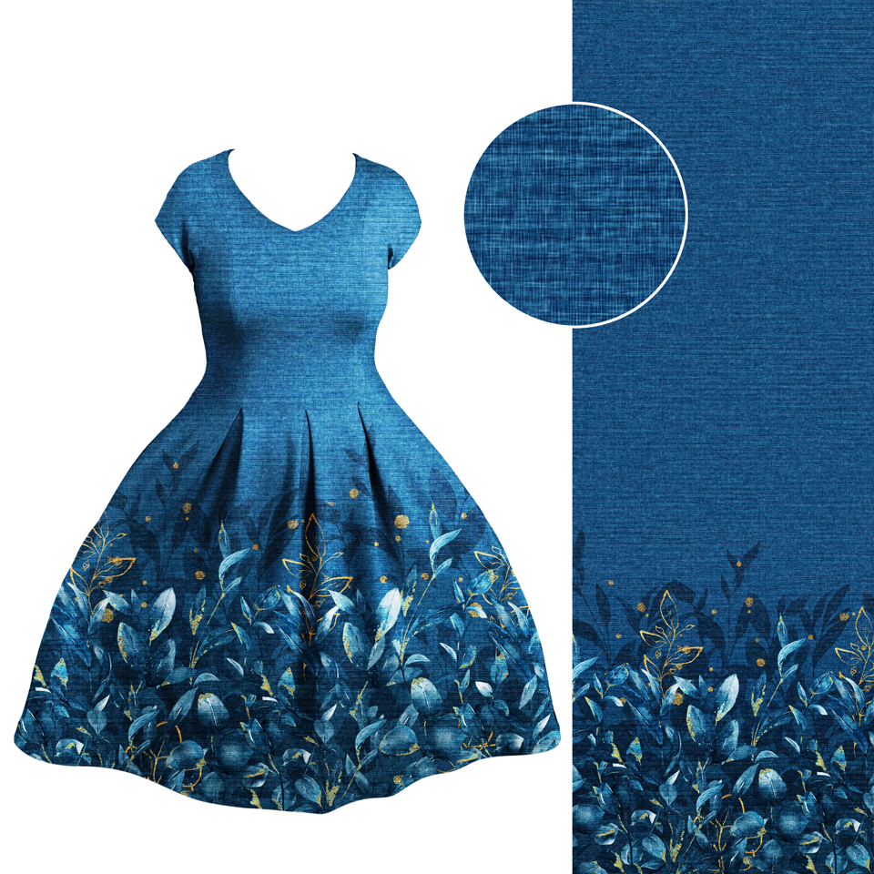Die Bordüre ist einseitig und ca. 50 cm hoch, für normal lange und Maxikleider geeignet. Der Fadenlauf ist quer zum Muster, was jedoch kein Problem darstellt, da der Stoff in beide Richtungen gleich elastisch ist und auch in beide Richtungen gleich schön fällt.