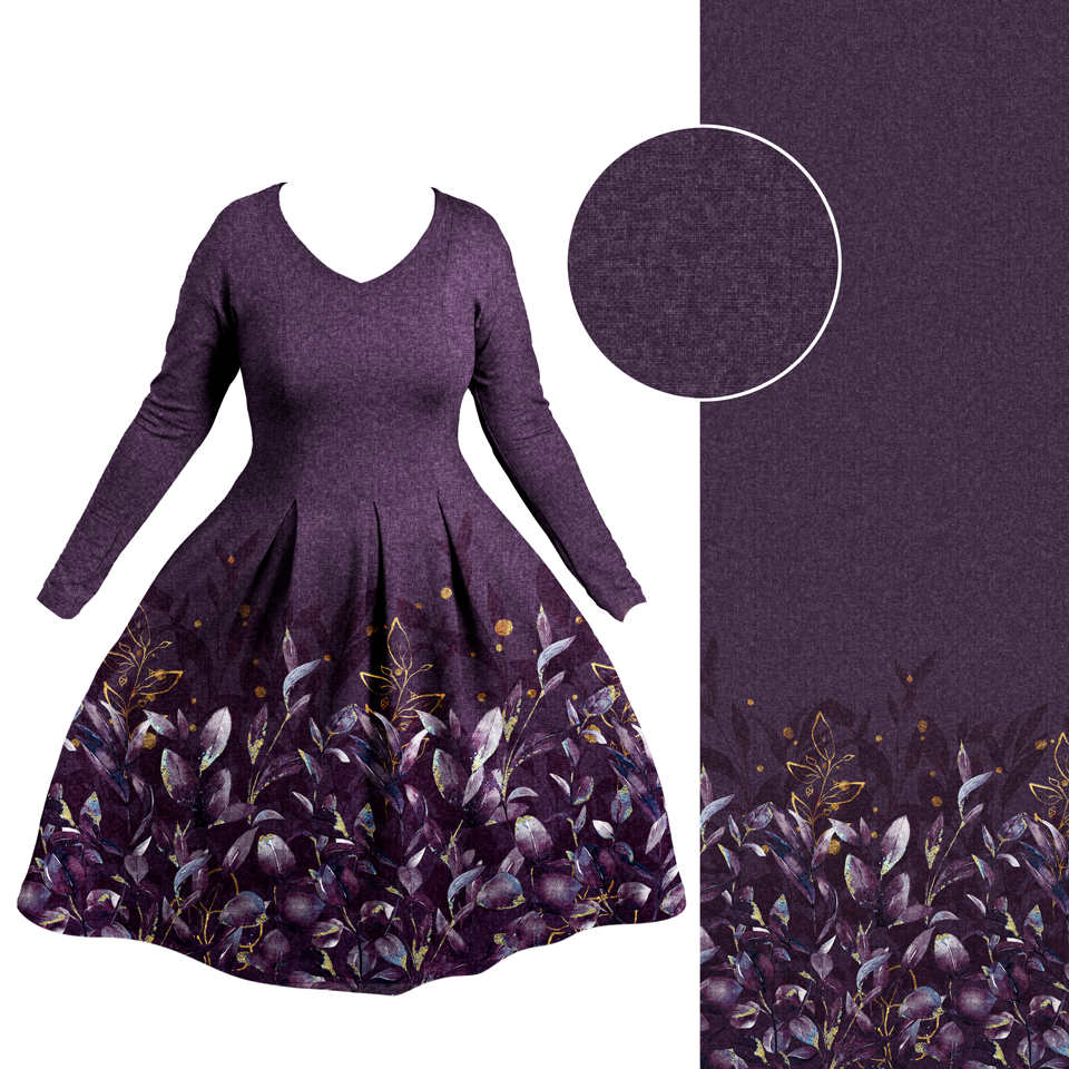 Die Bordüre ist einseitig ca. 50 cm hoch und bietet genug Raum für kreative Kleidung. Der Fadenlauf ist quer zum Muster, was jedoch kein Problem darstellt, da der Stoff in beide Richtungen gleich elastisch ist und auch in beide Richtungen gleich schön fällt.