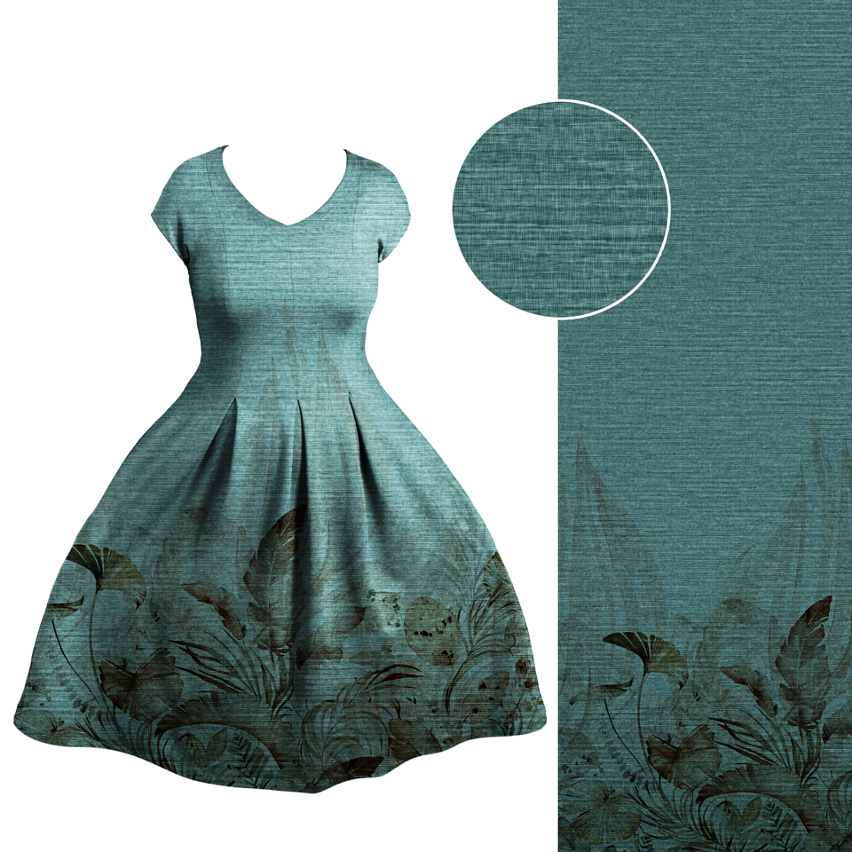 Die Bordüre ist einseitig und ca. 50 cm hoch, für normal lange und Maxikleider geeignet. Der Fadenlauf ist quer zum Muster, was jedoch kein Problem darstellt, da der Stoff in beide Richtungen gleich elastisch ist und auch in beide Richtungen gleich schön fällt.