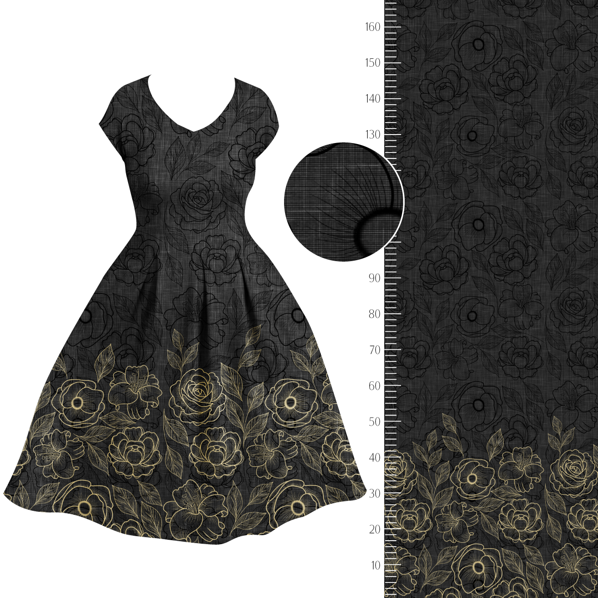 Der Fadenlauf der Bordüre (einseitig und ca. 40 cm breit) ist quer zum Muster, was jedoch kein Problem darstellt, da der Stoff in beide Richtungen gleich elastisch ist und auch in beide Richtungen gleich schön fällt.