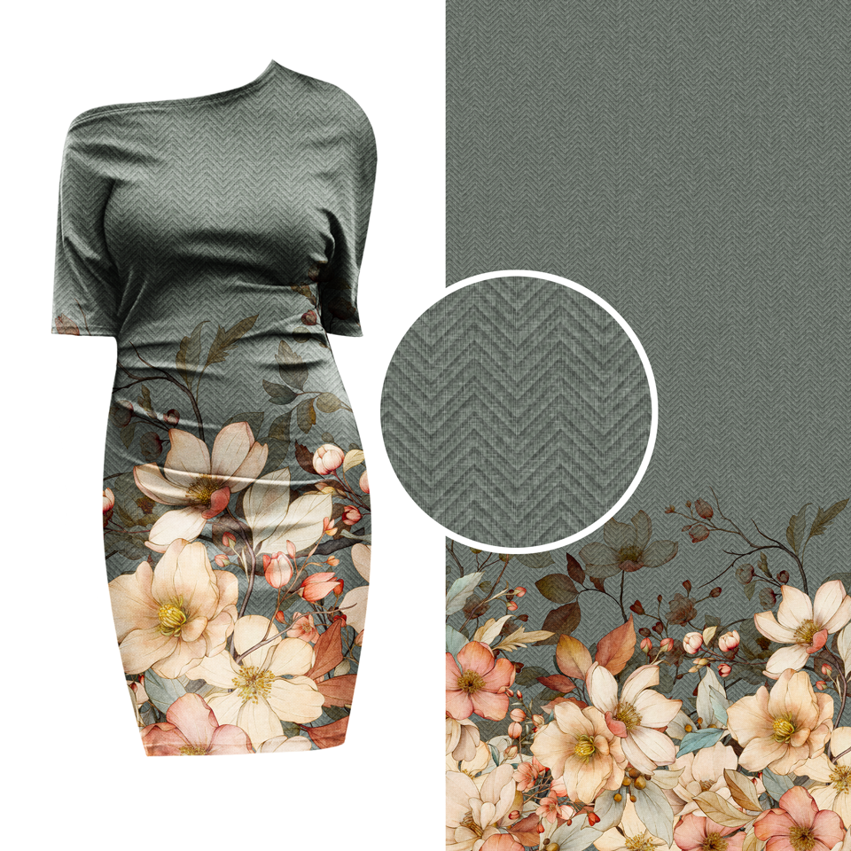 Die Bordüre ist ca. 60 cm breit und einseitig. Das Muster ist endlos, es ist kein Panel. Der Fadenlauf ist quer zum Muster, was jedoch kein Problem darstellt, da der Stoff in beide Richtungen gleich elastisch ist und auch in beide Richtungen gleich schön fällt.
