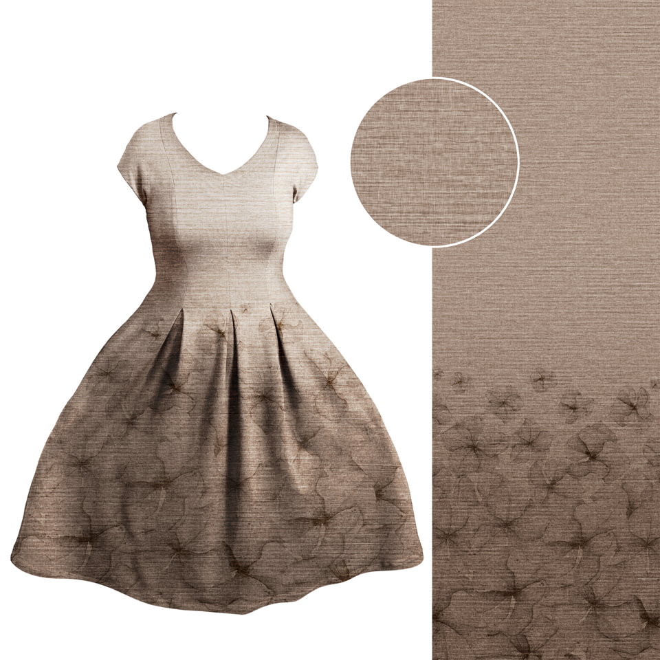 Die Bordüre ist einseitig und ca. 80 cm hoch, für normal lange und Maxikleider geeignet. Der Fadenlauf ist quer zum Muster, was jedoch kein Problem darstellt, da der Stoff in beide Richtungen gleich elastisch ist und auch in beide Richtungen gleich schön fällt.