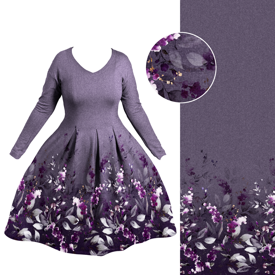 Die Bordüre ist einseitig und ca. 60 cm hoch, für normal lange und Maxikleider geeignet. Der Fadenlauf ist quer zum Muster, was jedoch kein Problem darstellt, da der Stoff in beide Richtungen gleich elastisch ist und auch in beide Richtungen gleich schön fällt.