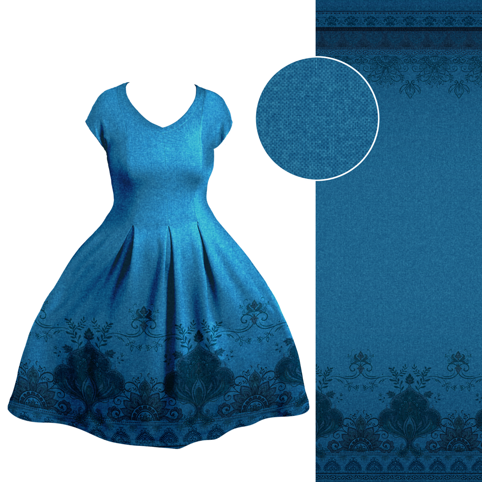 Die Bordüre ist beidseitig und 45 bzw. 35 cm hoch, für normal lange und Maxikleider geeignet. Der Fadenlauf ist quer zum Muster, was jedoch kein Problem darstellt, da der Stoff in beide Richtungen gleich elastisch ist und auch in beide Richtungen gleich schön fällt.
