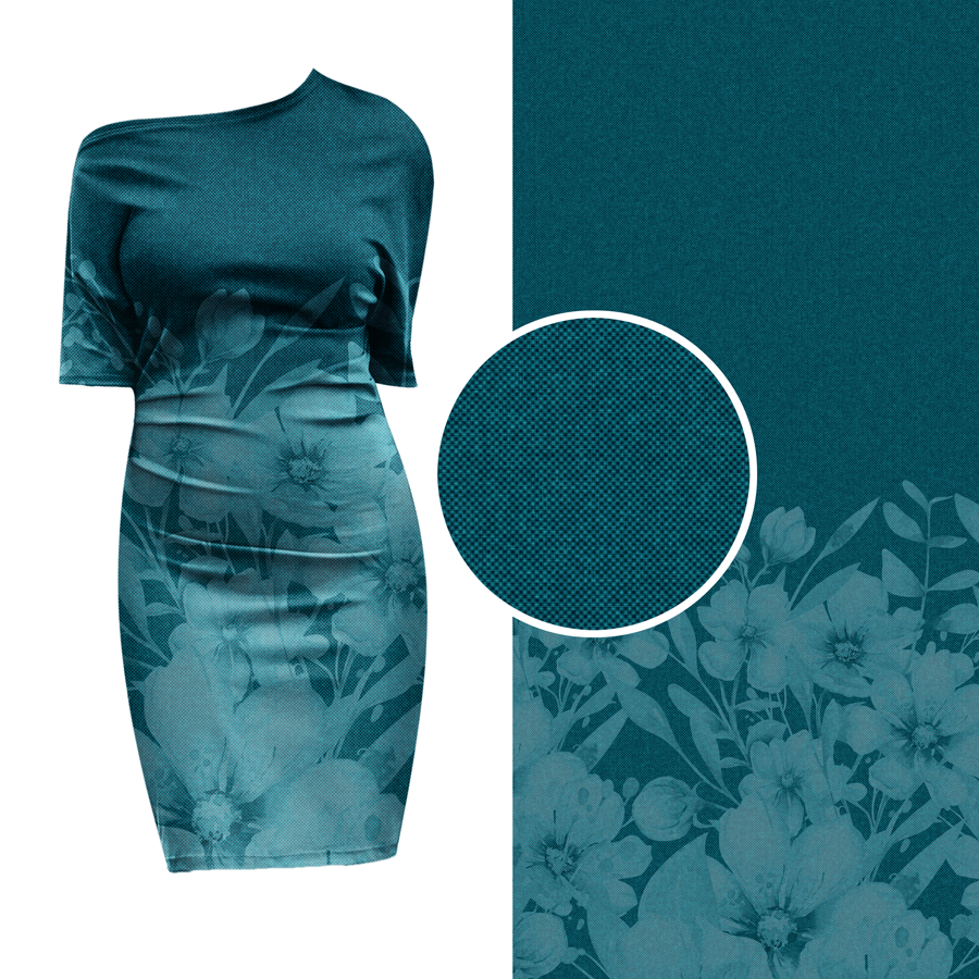 Die Bordüre ist einseitig und ca. 80 cm hoch, für normal lange und Maxikleider geeignet. Der Fadenlauf ist quer zum Muster, was jedoch kein Problem darstellt, da der Stoff in beide Richtungen gleich elastisch ist und auch in beide Richtungen gleich schön fällt.