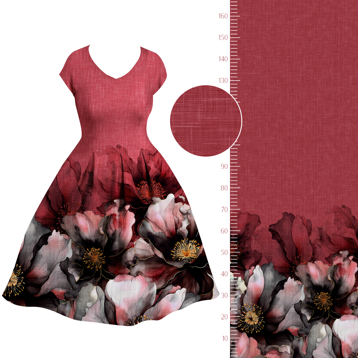 Der Fadenlauf der Bordüre (einseitig und ca. 70 cm breit) ist quer zum Muster, was jedoch kein Problem darstellt, da der Stoff in beide Richtungen gleich elastisch ist und auch in beide Richtungen gleich schön fällt.