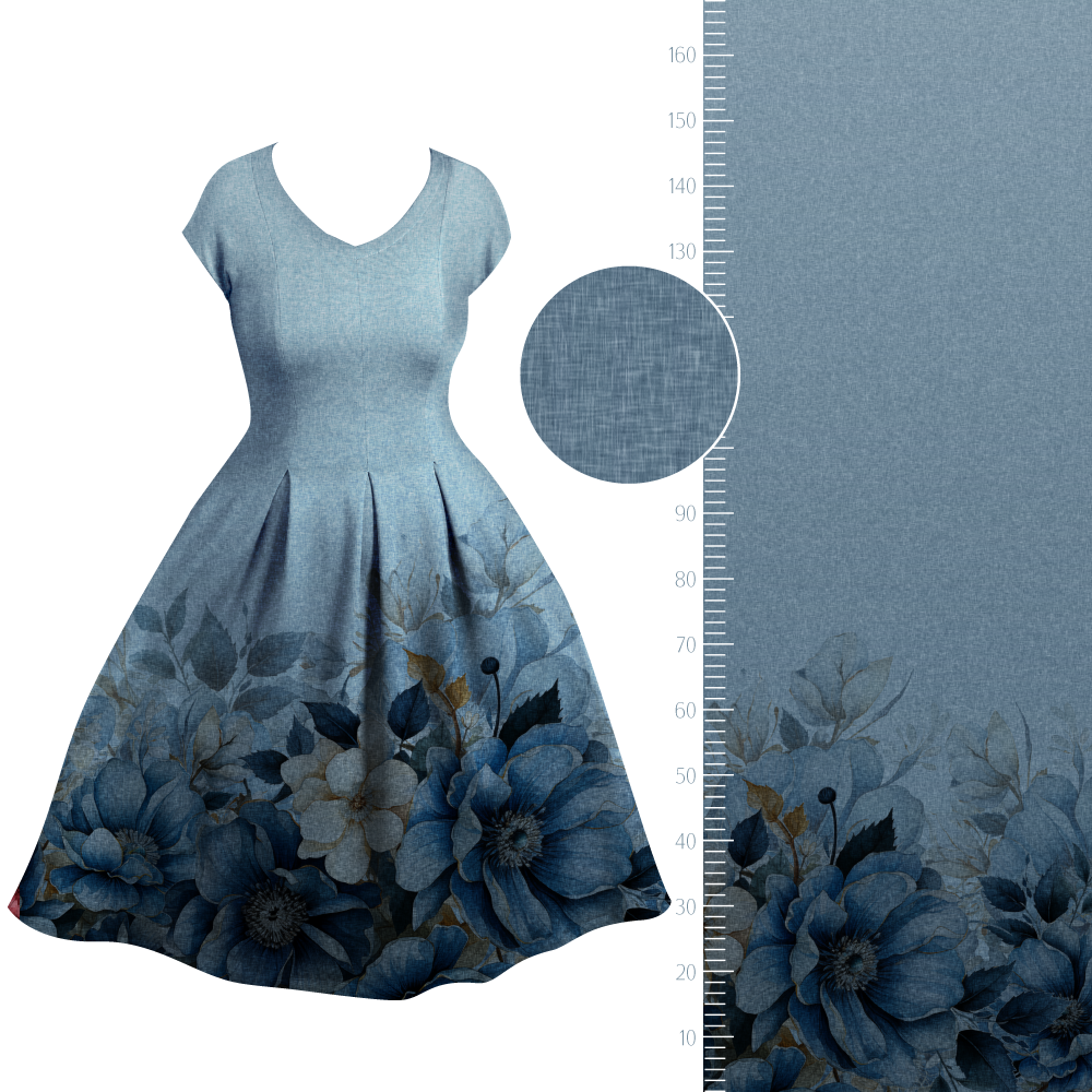 Der Fadenlauf der Bordüre (einseitig und ca. 50 cm breit) ist quer zum Muster, was jedoch kein Problem darstellt, da der Stoff in beide Richtungen gleich elastisch ist und auch in beide Richtungen gleich schön fällt.