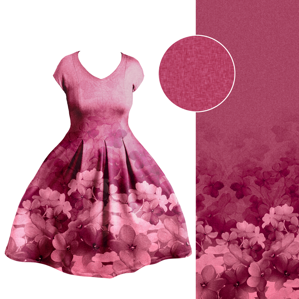 Die Bordüre ist einseitig und ca. 70 cm hoch, für normal lange und Maxikleider geeignet. Der Fadenlauf ist quer zum Muster, was jedoch kein Problem darstellt, da der Stoff in beide Richtungen gleich elastisch ist und auch in beide Richtungen gleich schön fällt.