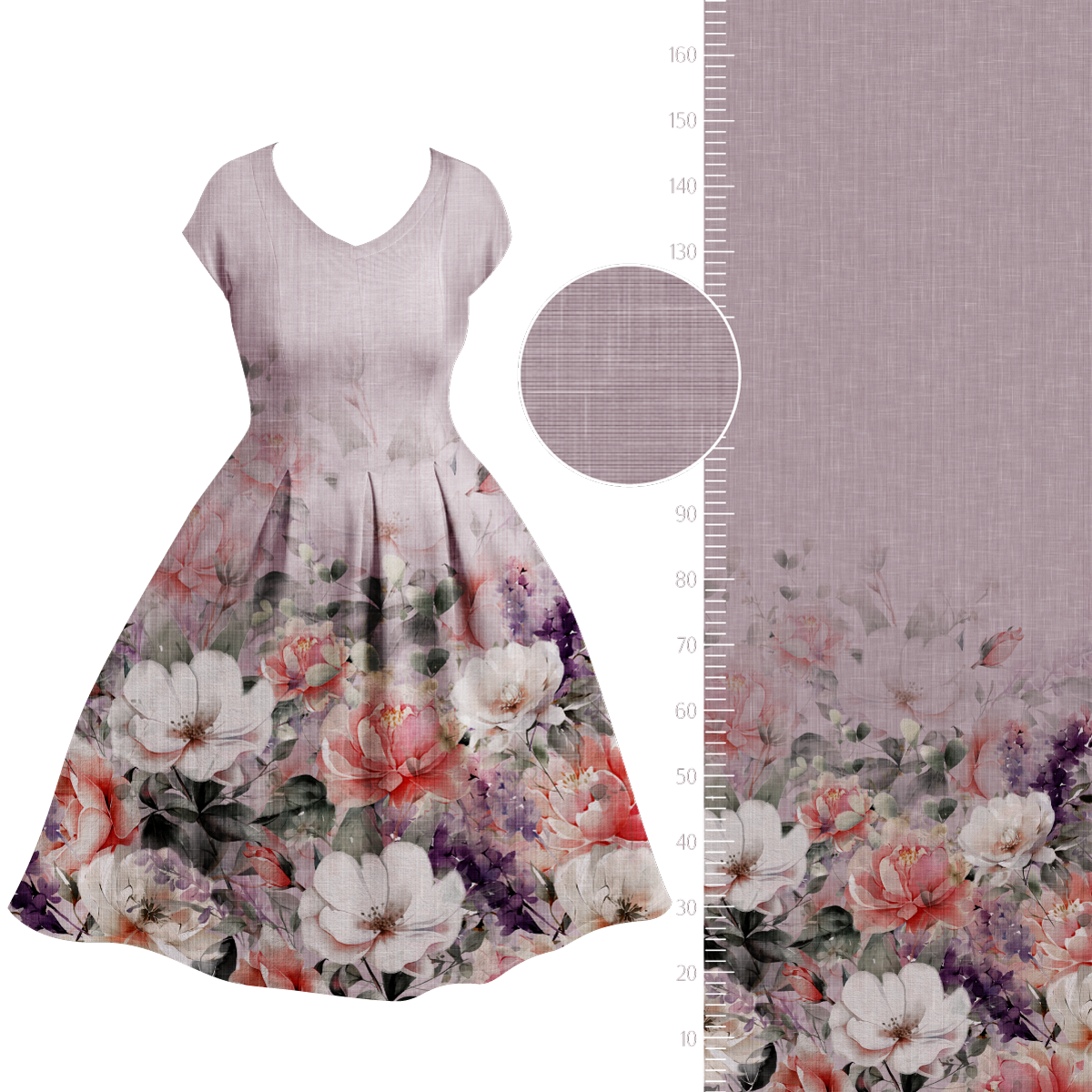 Der Fadenlauf der Bordüre (einseitig und ca. 70 cm breit) ist quer zum Muster, was jedoch kein Problem darstellt, da der Stoff in beide Richtungen gleich elastisch ist und auch in beide Richtungen gleich schön fällt.