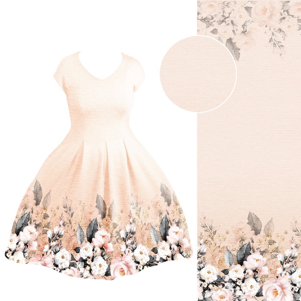 Die Bordürenmuster verlaufen entlang der Webkante und sind ca. 40, bzw 30 cm hoch. Der Fadenlauf ist quer zum Muster, was jedoch kein Problem darstellt, da der Stoff in beide Richtungen gleich elastisch ist und auch in beide Richtungen gleich schön fällt.