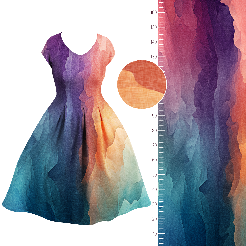 Der Fadenlauf des Stoffes ist quer zum Muster, was jedoch kein Problem darstellt, da der Stoff in beide Richtungen gleich elastisch ist und auch in beide Richtungen gleich schön fällt.