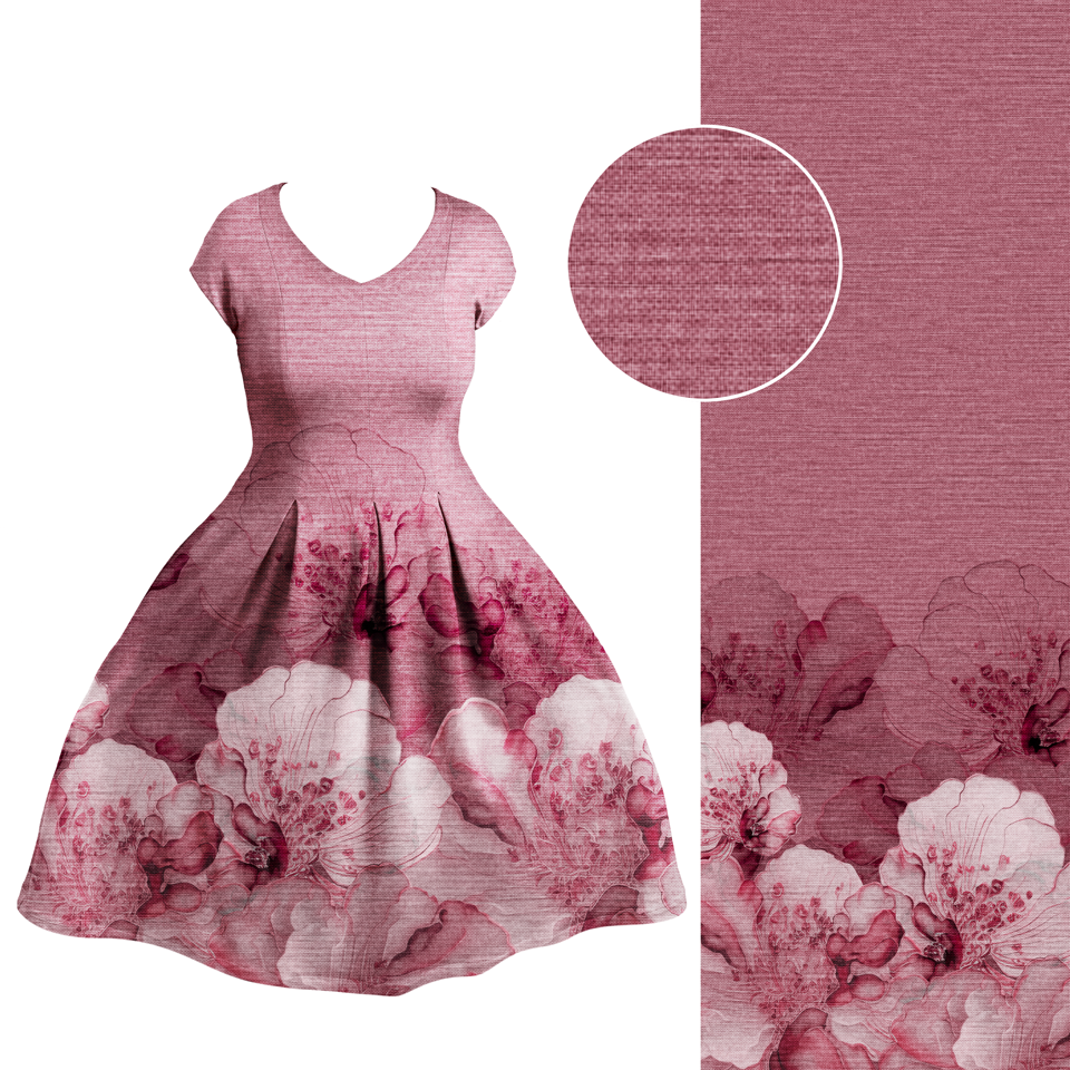 Die Bordüre ist einseitig und ca. 60 cm hoch, für normal lange und Maxikleider geeignet. Der Fadenlauf ist quer zum Muster, was jedoch kein Problem darstellt, da der Stoff in beide Richtungen gleich elastisch ist und auch in beide Richtungen gleich schön fällt.