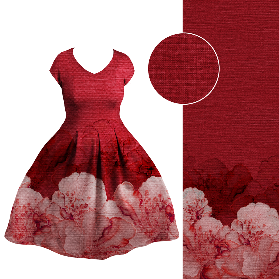 Die Bordüre ist einseitig und ca. 60 cm hoch, für normal lange und Maxikleider geeignet. Der Fadenlauf ist quer zum Muster, was jedoch kein Problem darstellt, da der Stoff in beide Richtungen gleich elastisch ist und auch in beide Richtungen gleich schön fällt.