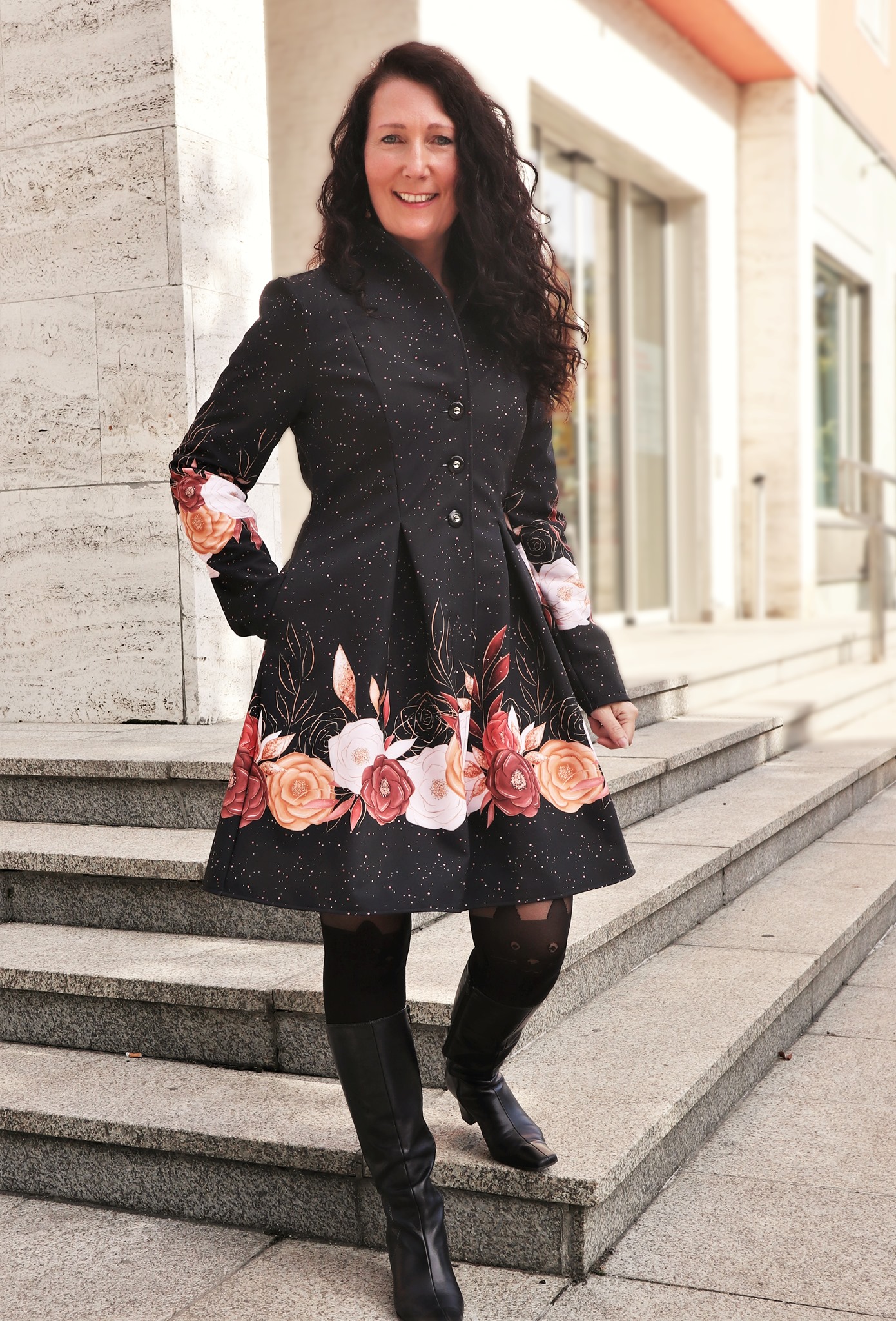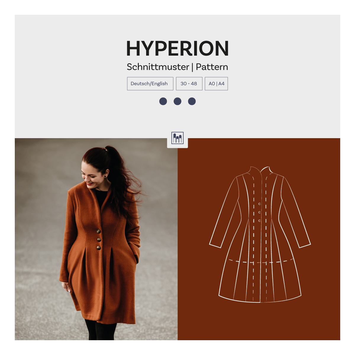 „Hyperion“ ist ein eleganter Mantel mit drei tiefen Kellerfalten hinten und zwei vorn. Das Oberteil ist mit Prinzessnähten und ohne Unterteilung zum Rockteil, wodurch Bordürenstoffe perfekt zur Geltung kommen.