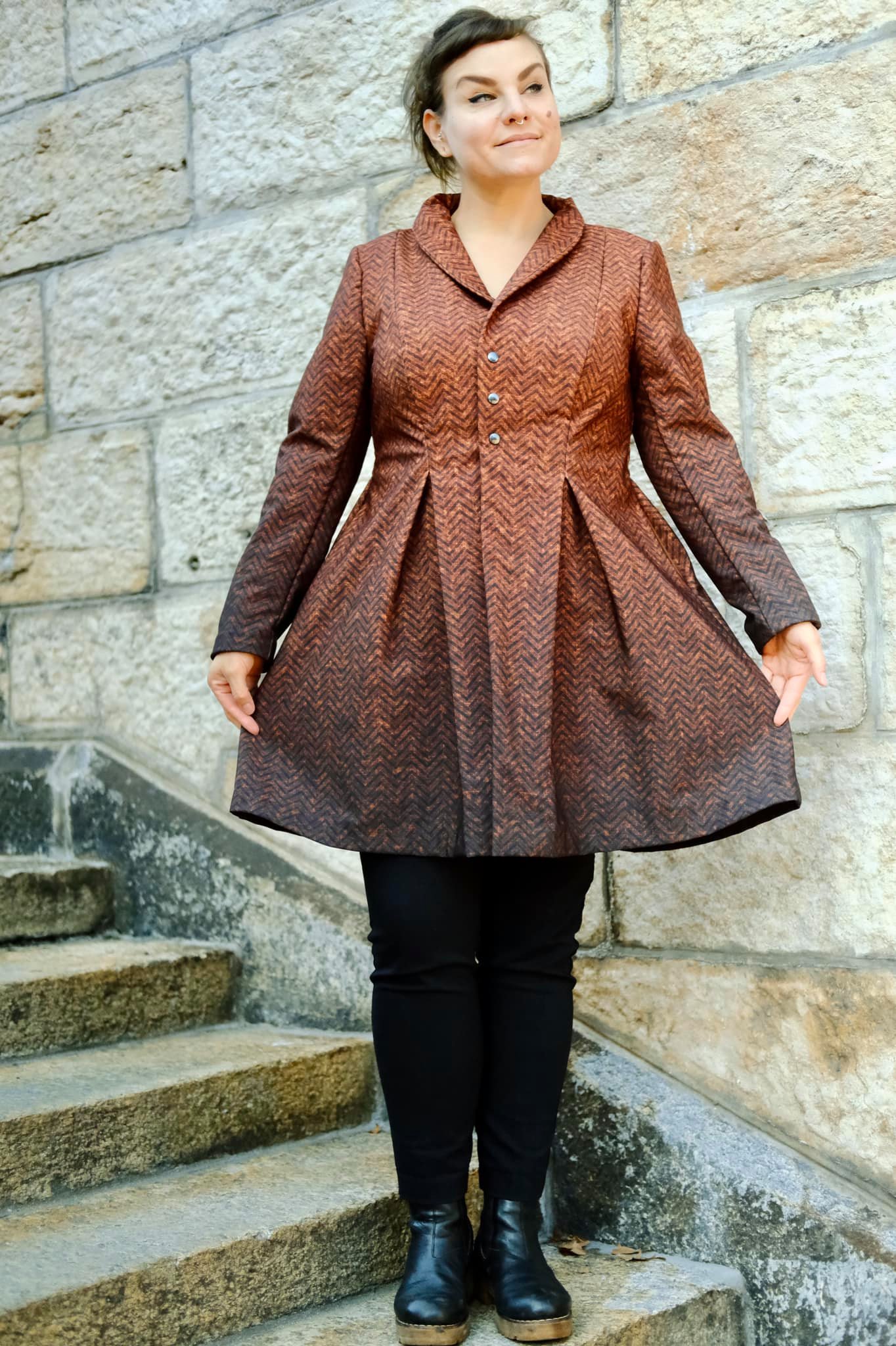 „Hyperion“ is an elegant coat with three deep box pleats at the back and two at the front. The top has princess seams and is not divided from the skirt, which means that border fabrics are shown to their best advantage.