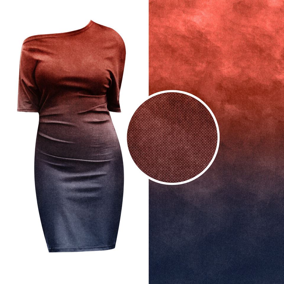 Der Verlauf ist von Webkante zur Webkante, für normal lange und Maxikleider geeignet. Der Fadenlauf ist quer zum Muster, was jedoch kein Problem darstellt, da der Stoff in beide Richtungen gleich elastisch ist und auch in beide Richtungen gleich schön fällt.