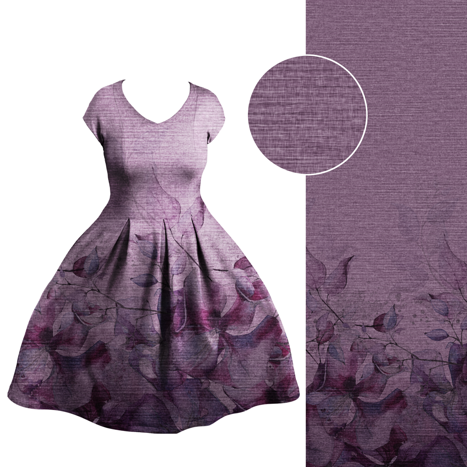 Die Bordüre ist einseitig und ca. 80 cm hoch, für normal lange und Maxikleider geeignet. Der Fadenlauf ist quer zum Muster, was jedoch kein Problem darstellt, da der Stoff in beide Richtungen gleich elastisch ist und auch in beide Richtungen gleich schön fällt.