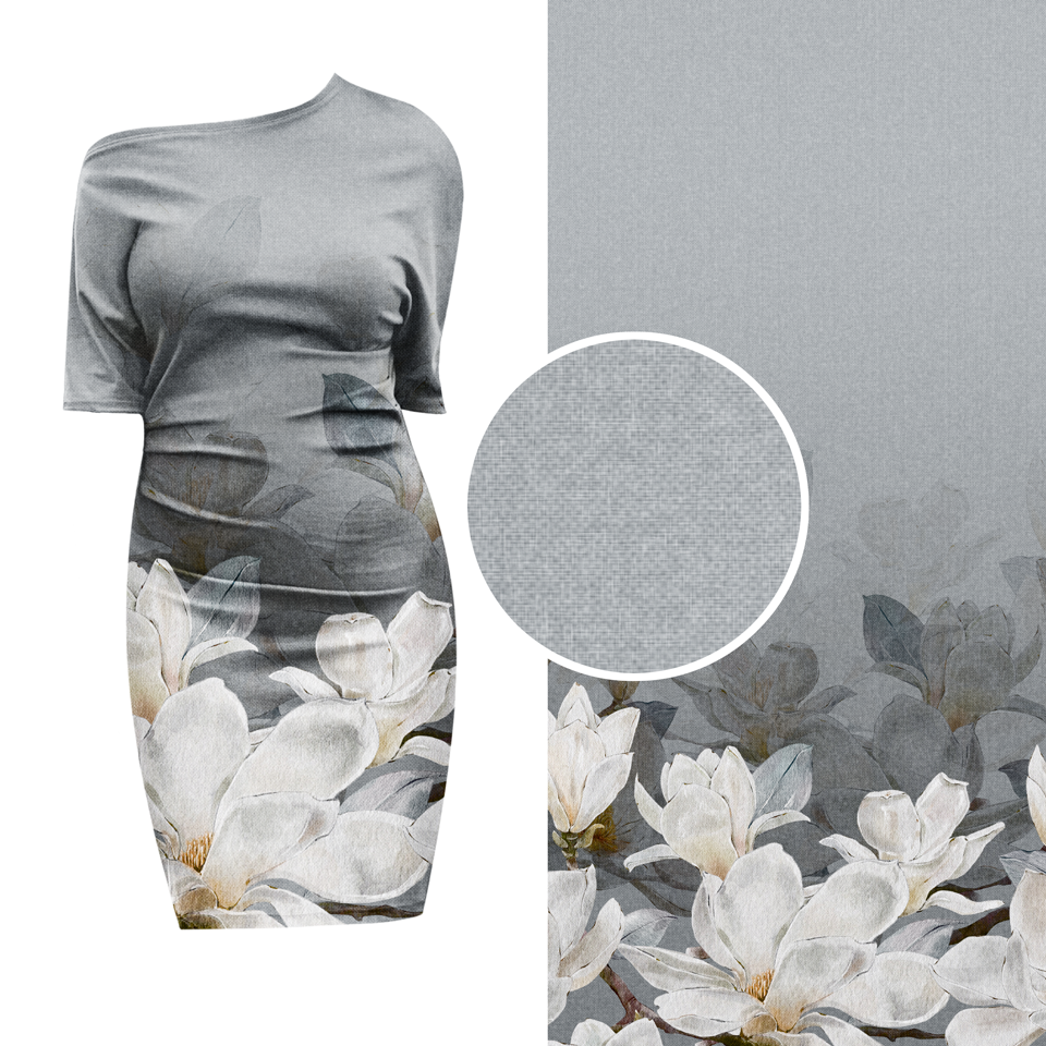 Die Bordüre ist einseitig un d ca. 85 cm hoch, für normal lange und Maxikleider geeignet. Der Fadenlauf ist quer zum Muster, was jedoch kein Problem darstellt, da der Stoff in beide Richtungen gleich elastisch ist und auch in beide Richtungen gleich schön fällt.