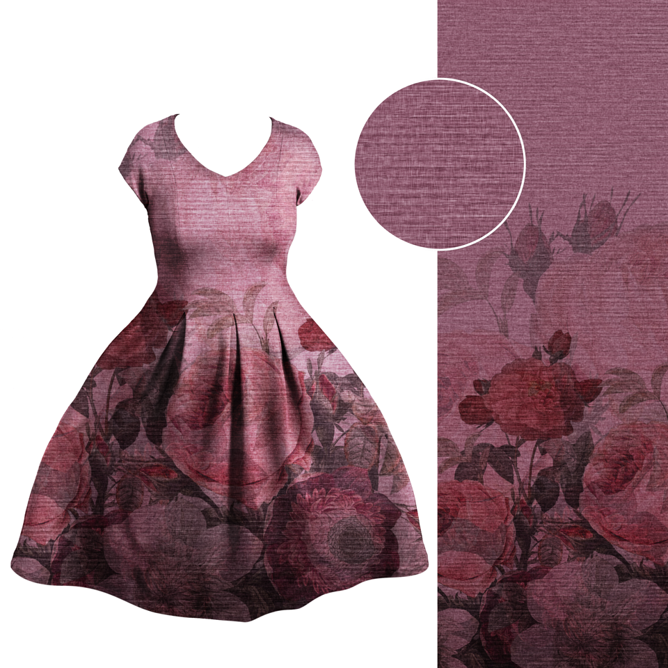 Die Bordüre ist einseitig und ca. 80 cm hoch, für normal lange und Maxikleider geeignet. Der Fadenlauf ist quer zum Muster, was jedoch kein Problem darstellt, da der Stoff in beide Richtungen gleich elastisch ist und auch in beide Richtungen gleich schön fällt.