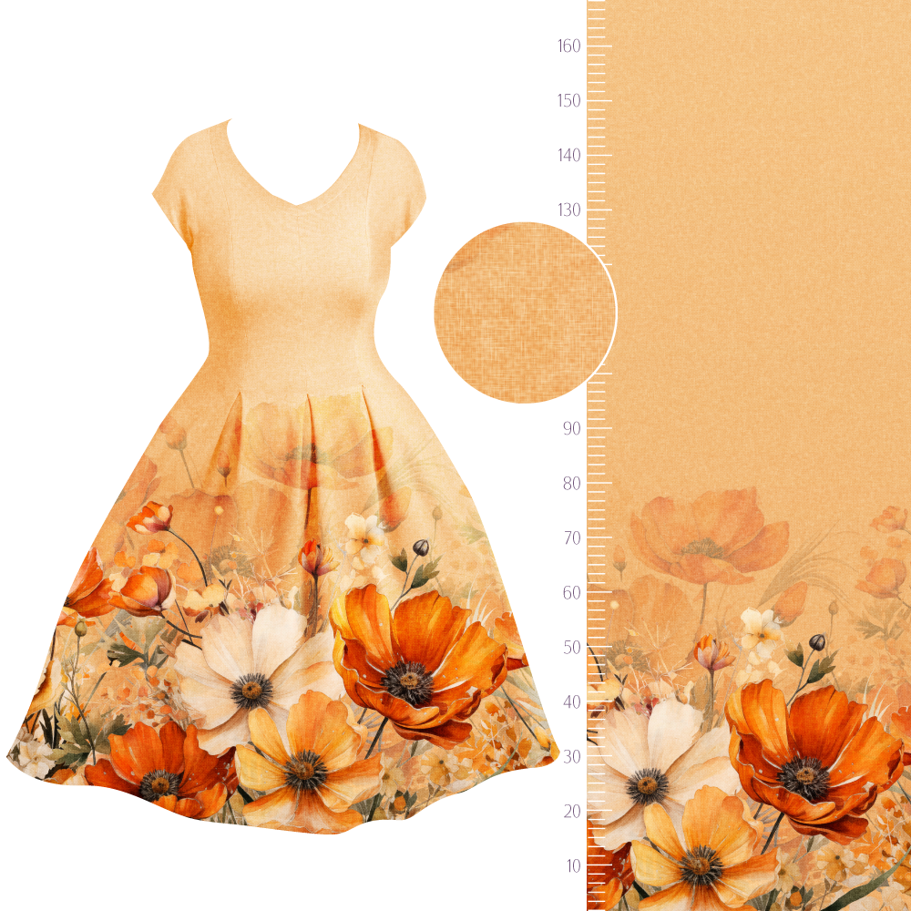 Der Fadenlauf der Bordüre (einseitig und ca. 65 cm breit) ist quer zum Muster, was jedoch kein Problem darstellt, da der Stoff in beide Richtungen gleich elastisch ist und auch in beide Richtungen gleich schön fällt.