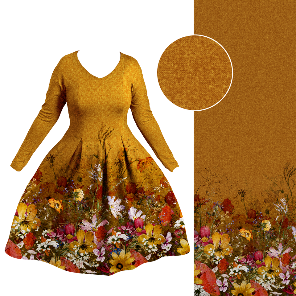 Die Bordüre ist einseitig und ca. 60 cm hoch, für normal lange und Maxikleider geeignet. Der Fadenlauf ist quer zum Muster, was jedoch kein Problem darstellt, da der Stoff in beide Richtungen gleich elastisch ist und auch in beide Richtungen gleich schön fällt.
