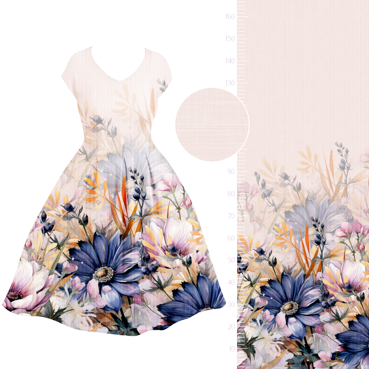 Der Fadenlauf der Bordüre (einseitig und ca. 90 cm breit) ist quer zum Muster, was jedoch kein Problem darstellt, da der Stoff in beide Richtungen gleich elastisch ist und auch in beide Richtungen gleich schön fällt.