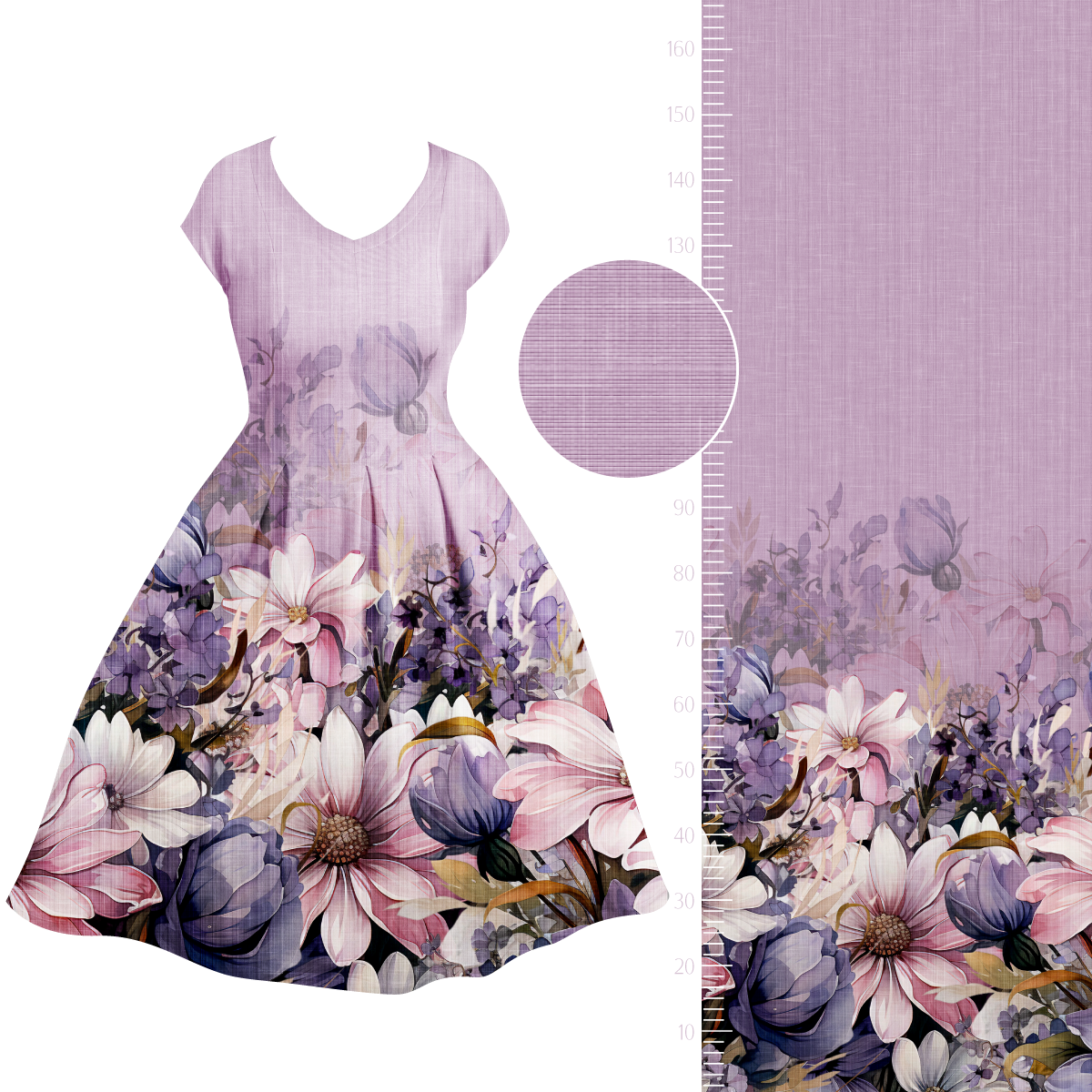 Der Fadenlauf der Bordüre (einseitig und ca. 80 cm breit) ist quer zum Muster, was jedoch kein Problem darstellt, da der Stoff in beide Richtungen gleich elastisch ist und auch in beide Richtungen gleich schön fällt.